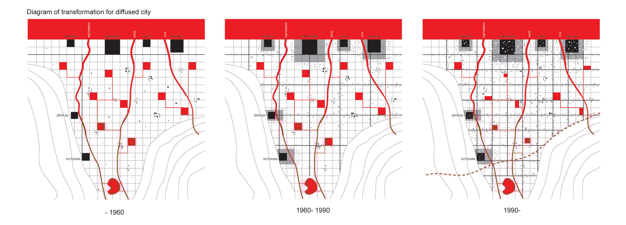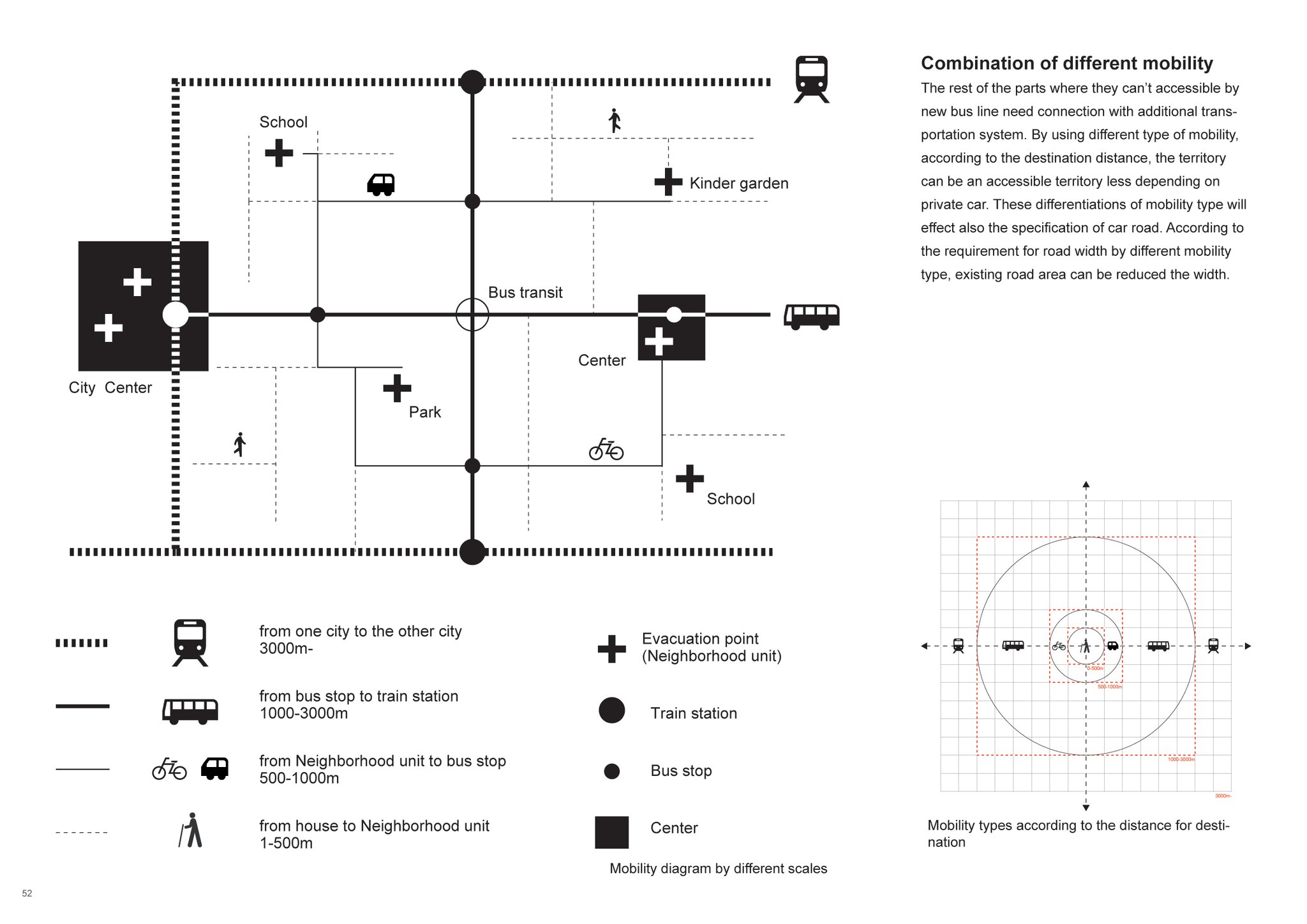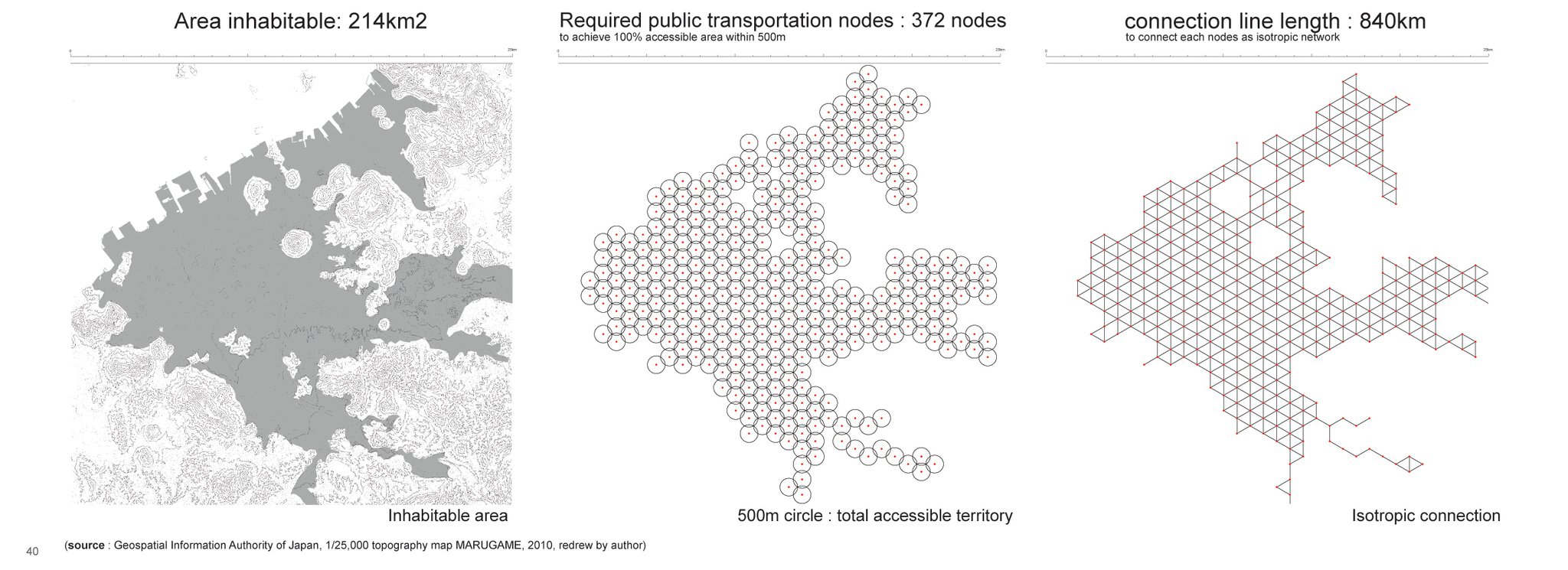 人口減少時代における、スプロールした離散都市の縮小シナリオを探る。 国策となっている既成市街地への都市のコンパクト化の方針は、高度に離散している都市の場合ではかえって縮退のための社会的コストが増大してしまう懸念がある。本計画では、離散都市という都市骨格を維持しながら、人口減少社会に適応した都市の在り方を2つのシナリオから描き出すことを試みた。