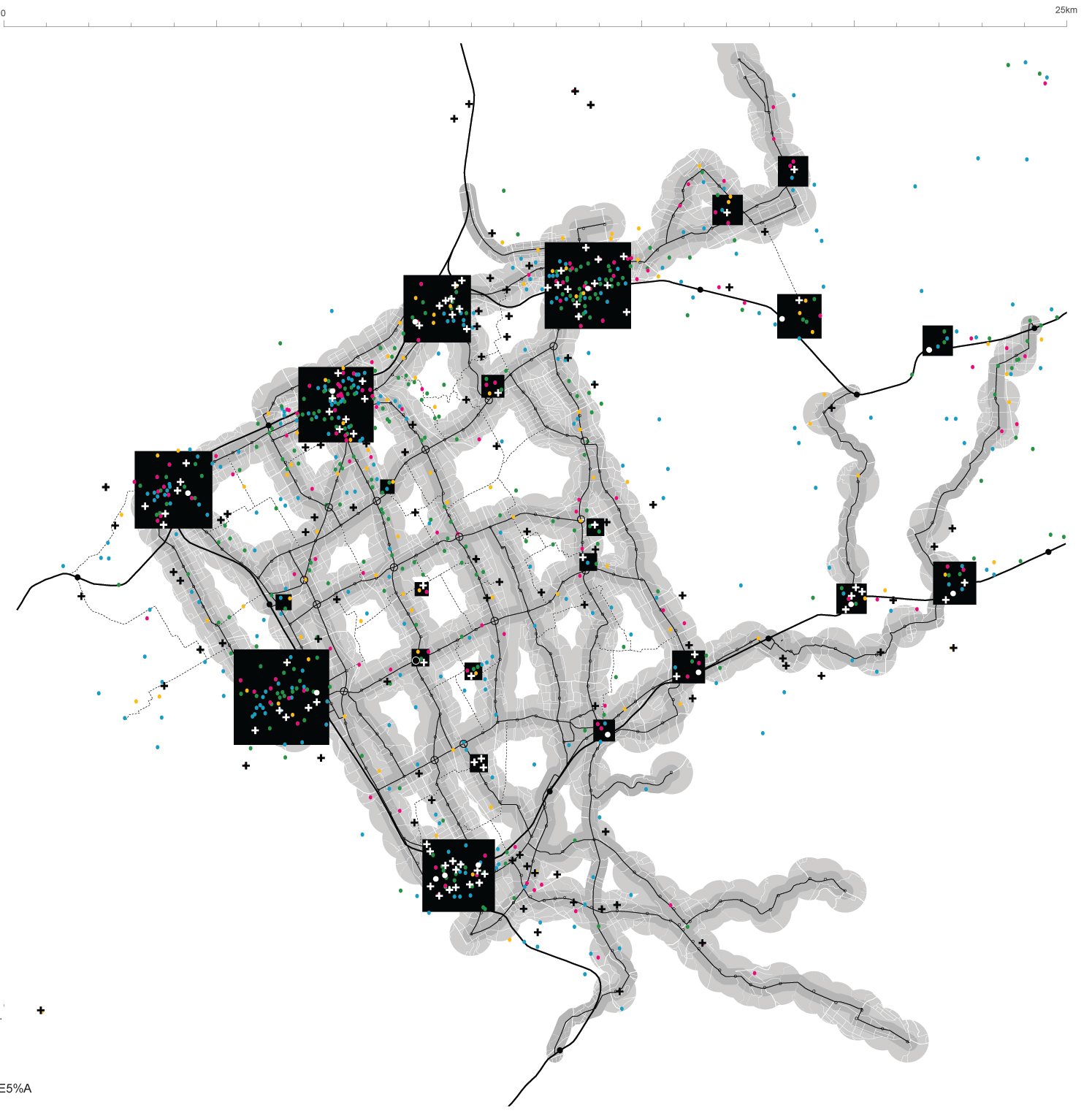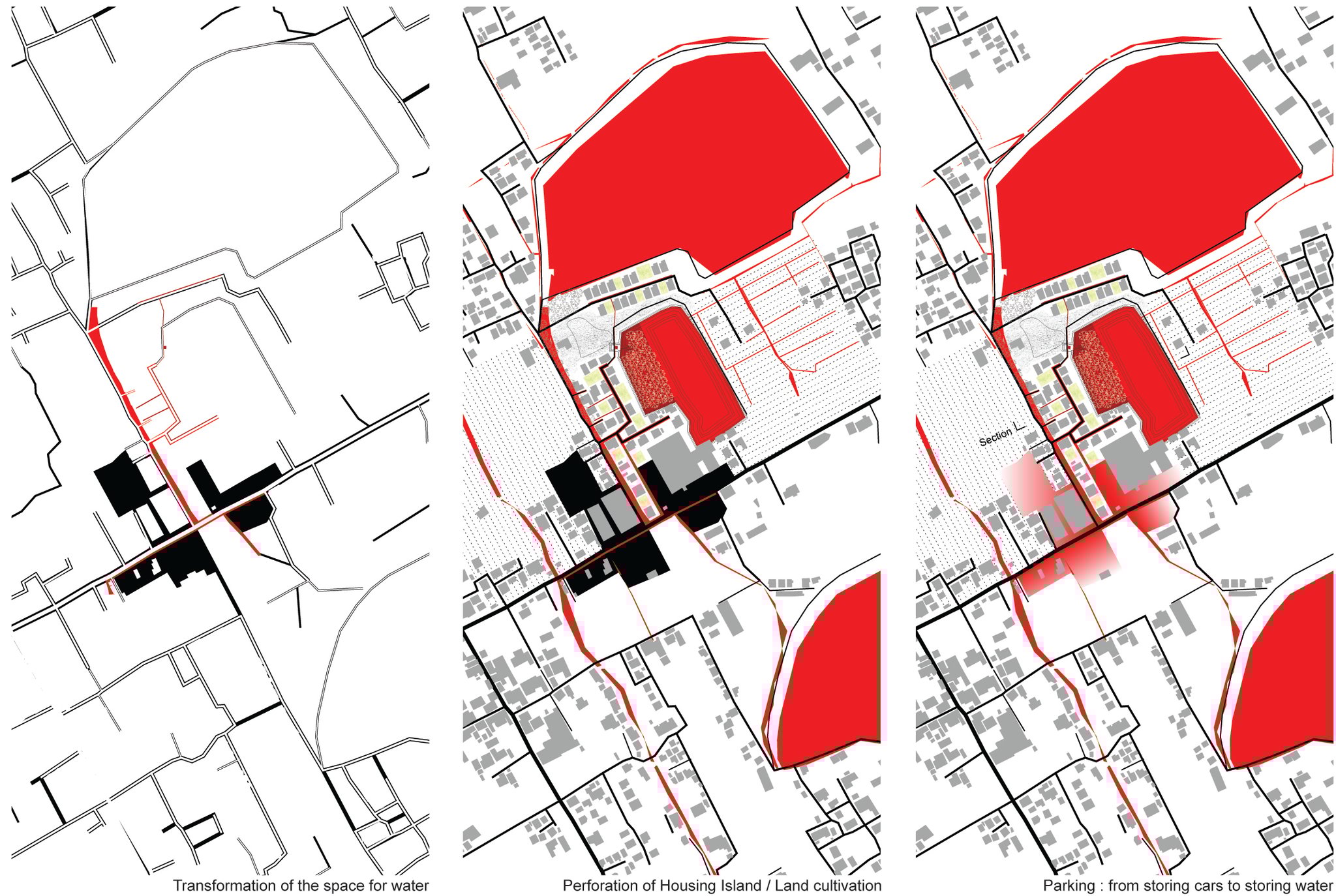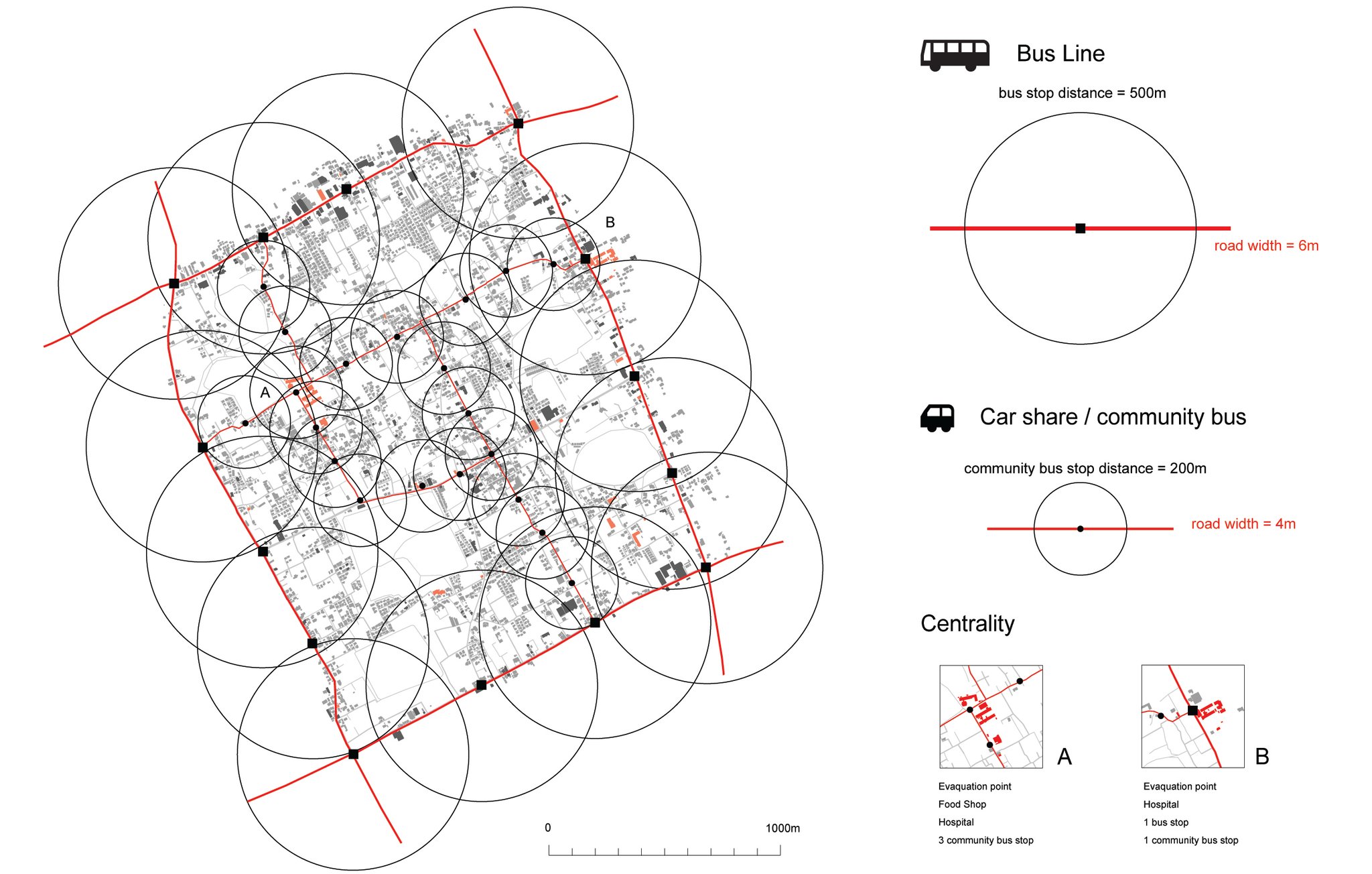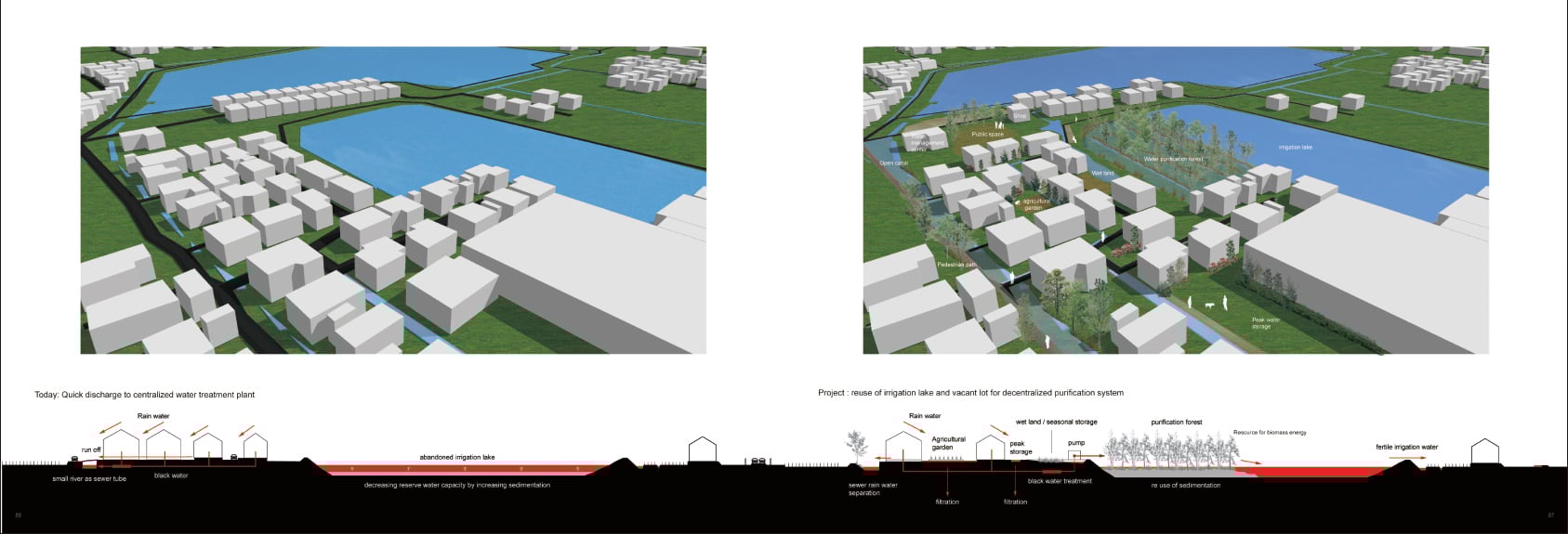 人口減少時代における、スプロールした離散都市の縮小シナリオを探る。 国策となっている既成市街地への都市のコンパクト化の方針は、高度に離散している都市の場合ではかえって縮退のための社会的コストが増大してしまう懸念がある。本計画では、離散都市という都市骨格を維持しながら、人口減少社会に適応した都市の在り方を2つのシナリオから描き出すことを試みた。
